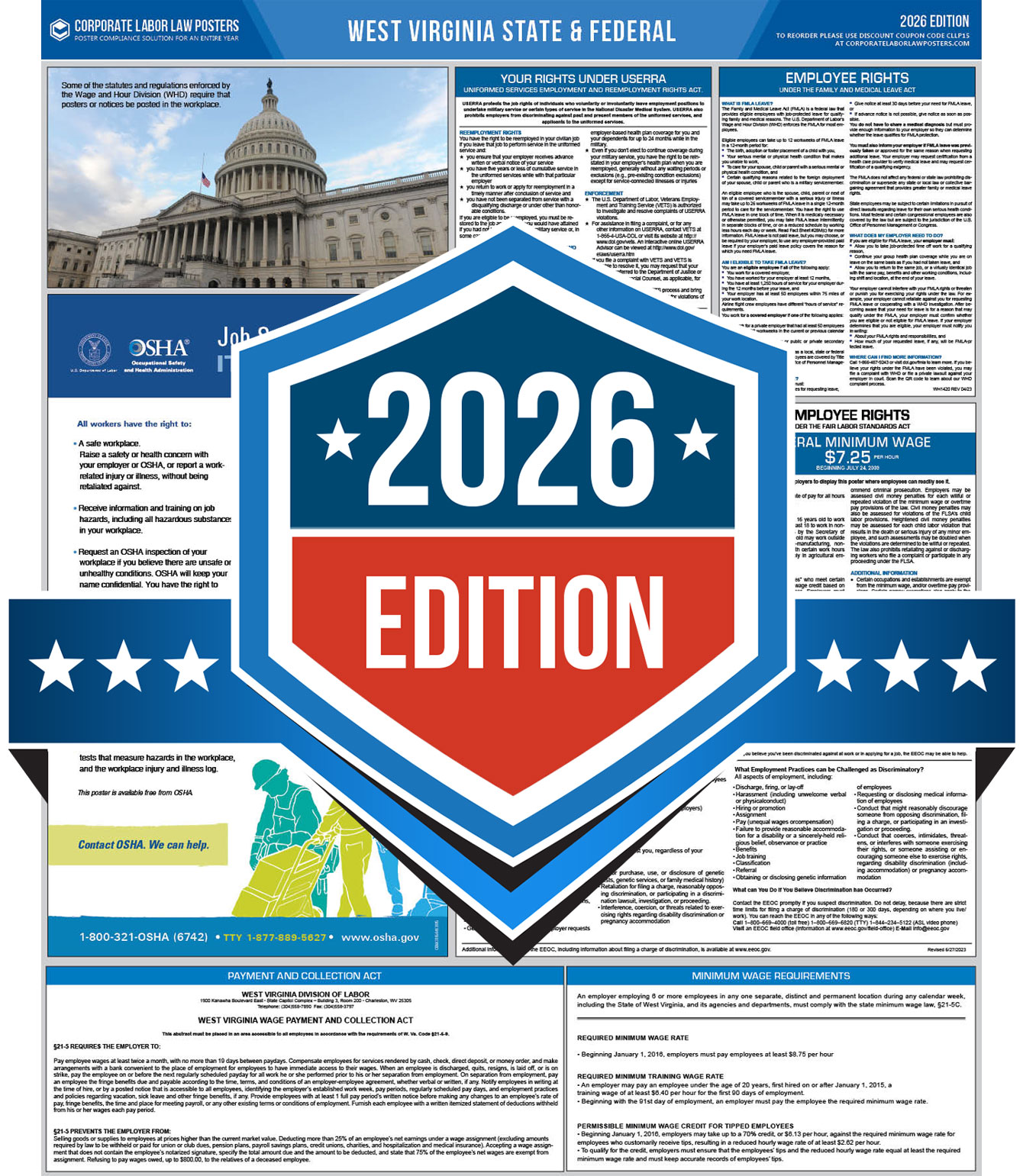 With frequent changes to state and federal regulations, purchasing from Corporate Labor Law Posters™ guarantees that you have the latest version of the 2026 West Virginia Labor Law Poster. Avoid costly fines and demonstrate your commitment to employee rights with our comprehensive compliance solutions.