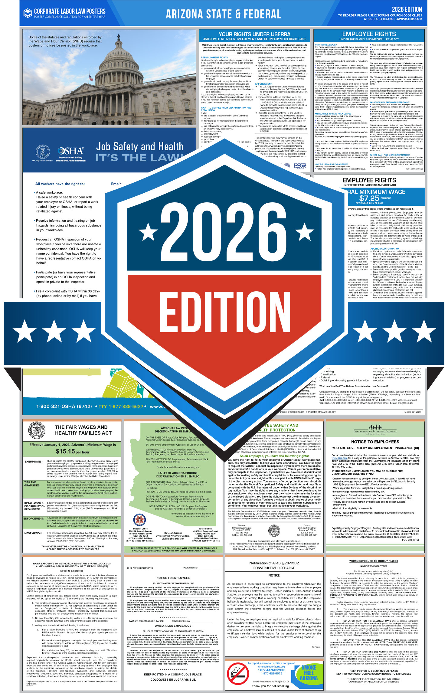 Ensure full compliance and protect your business with our Arizona Labor Law Poster Renewal Service. This service includes the up-to-date new 2026 Arizona Labor Law Poster, featuring all required state and federal labor law changes. With guaranteed compliance, automatic updates, continuous monitoring of labor law regulations, and a focus on reducing the risk of employment law disputes, this subscription service keeps your workplace legally compliant and worry-free.