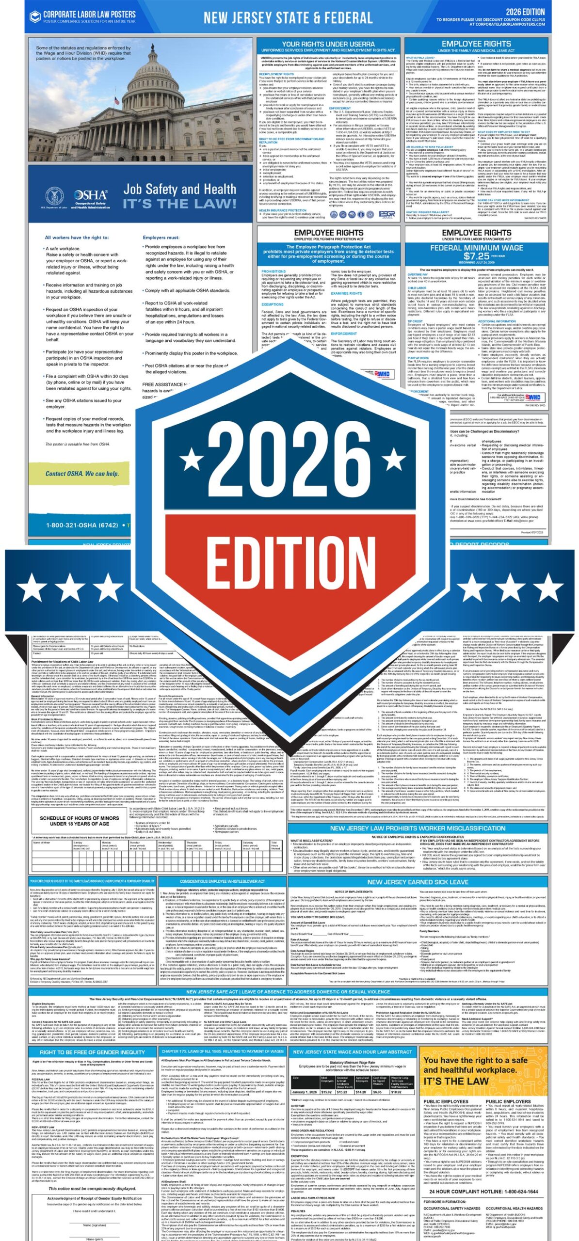 Ensure full compliance and protect your business with our New Jersey Labor Law Poster Renewal Service. This service includes the up-to-date new 2026 New Jersey Labor Law Poster, featuring all required state and federal labor law changes. With guaranteed compliance, automatic updates, continuous monitoring of labor law regulations, and a focus on reducing the risk of employment law disputes, this subscription service keeps your workplace legally compliant and worry-free.